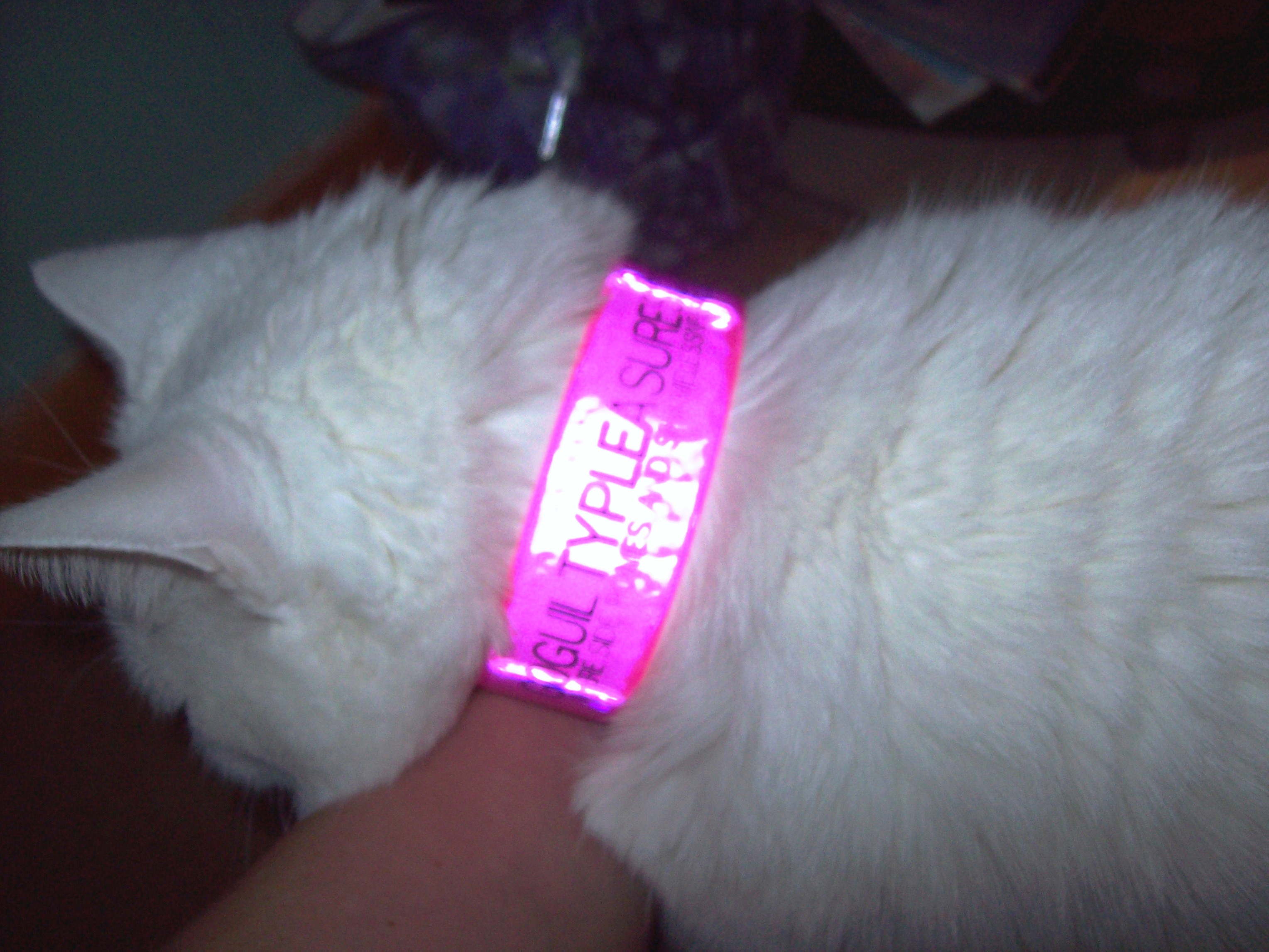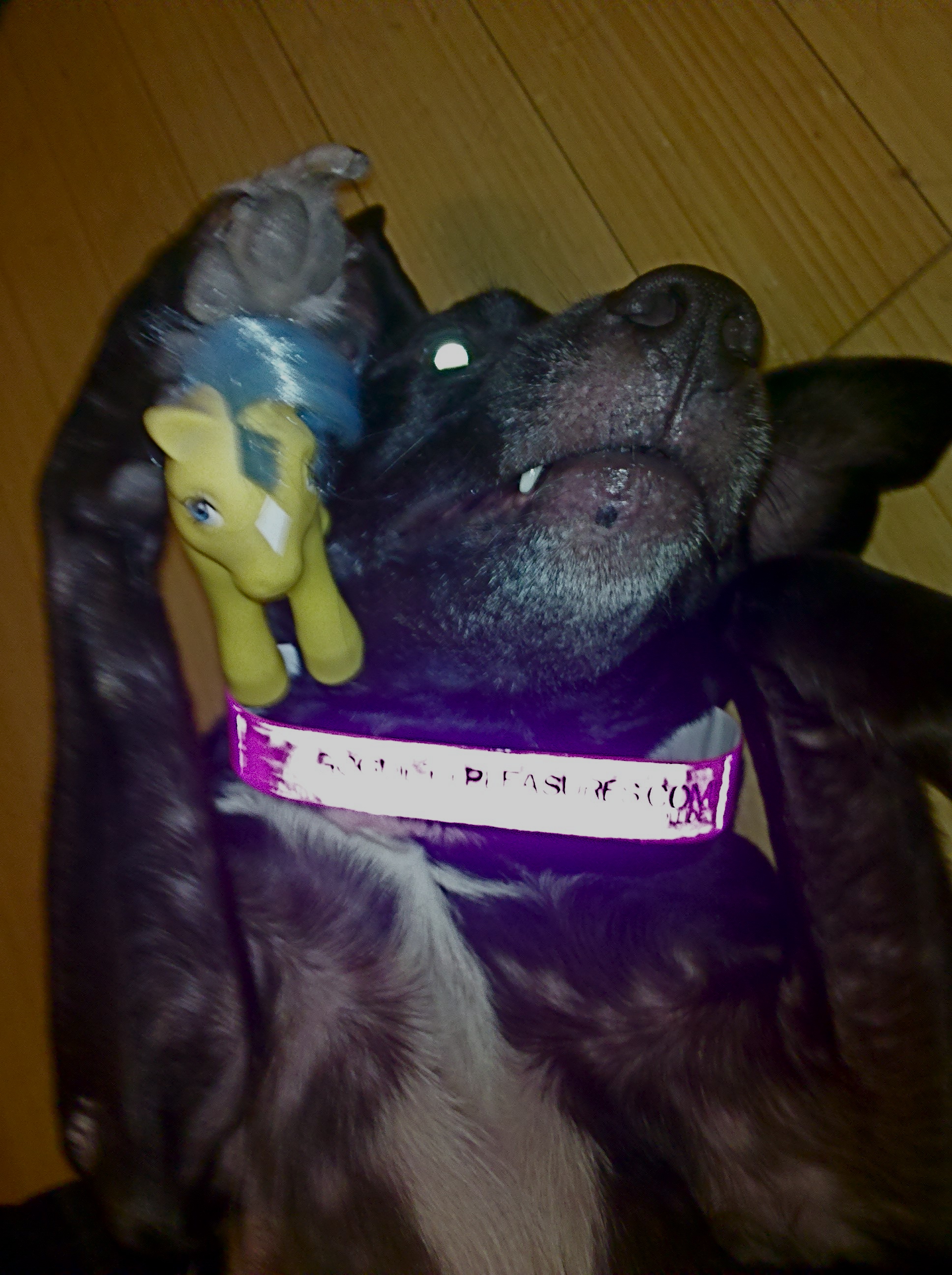 … Then I took it home where Shelby modeled it (reluctantly) on her ankle and on her tail, and drooled when I put it around her favorite guilty pleasure – Milkbones…