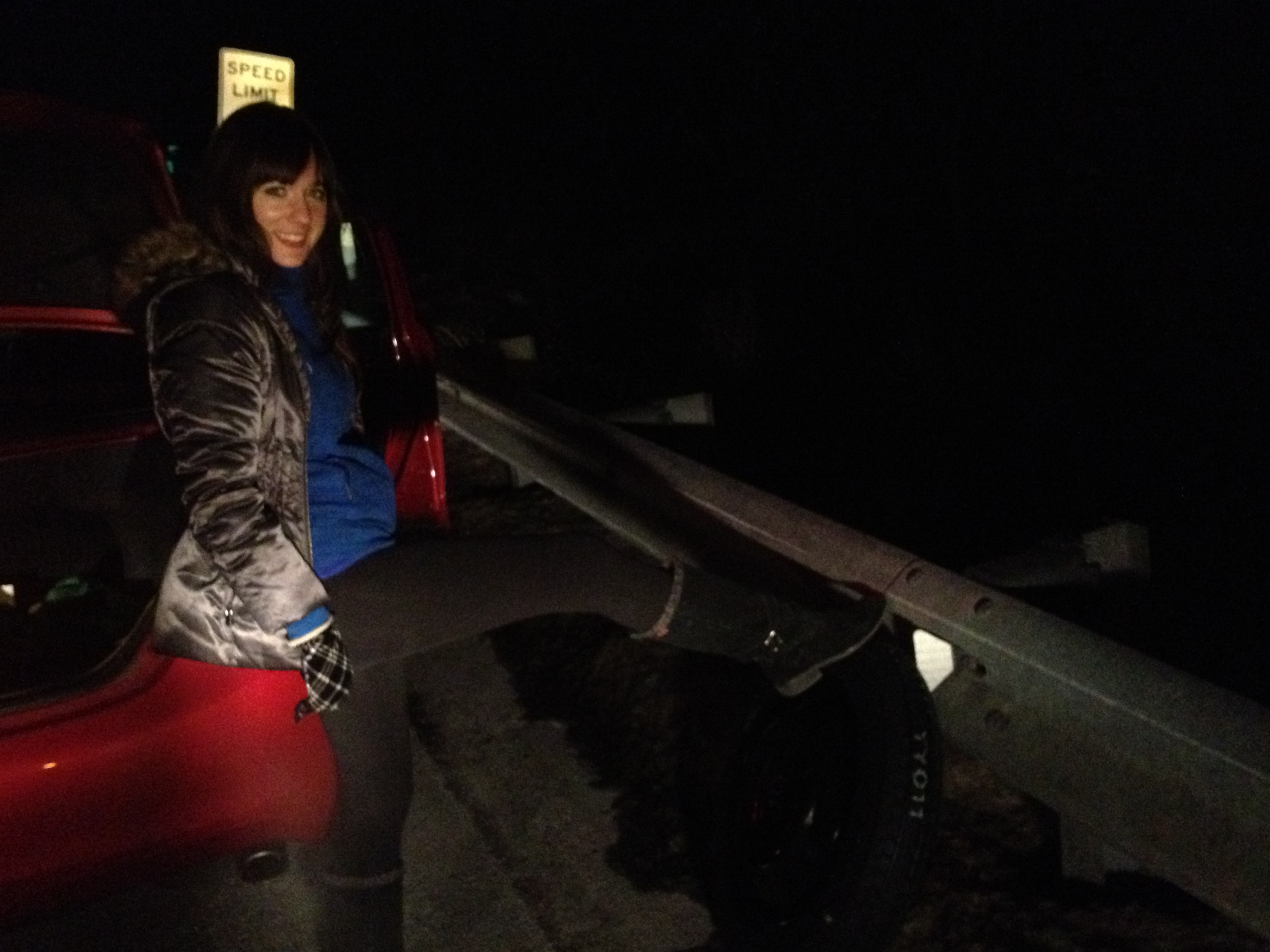 In under 30 minutes, a tow truck arrived. The driver got the spare out of the trunk and started rooting around while Rachel and I bounced up and down trying to keep warm.