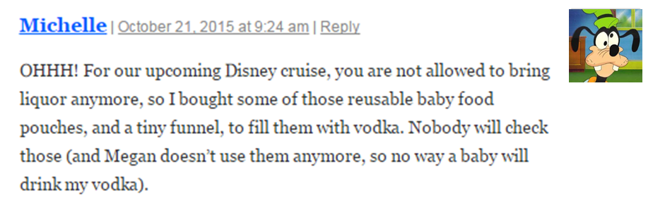 Congratulations, Michelle! Your dedication to booze smuggling, coupled with your willingness to defile the Disney name, won the heart of our judge, Babs (mom)!