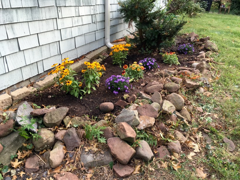 I got home yesterday and someone had planted flowers. Lovely purple, orange and yellow, ah, daisiesgeraniums I-don’t-know-’ems, just to the side of my door.