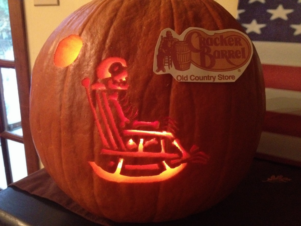 The pumpkin I carved for last year’s winner (Deb Bryan a.k.a. The Monster in Your Closet). No…it’s not giving the middle finger. We’ve been through this.