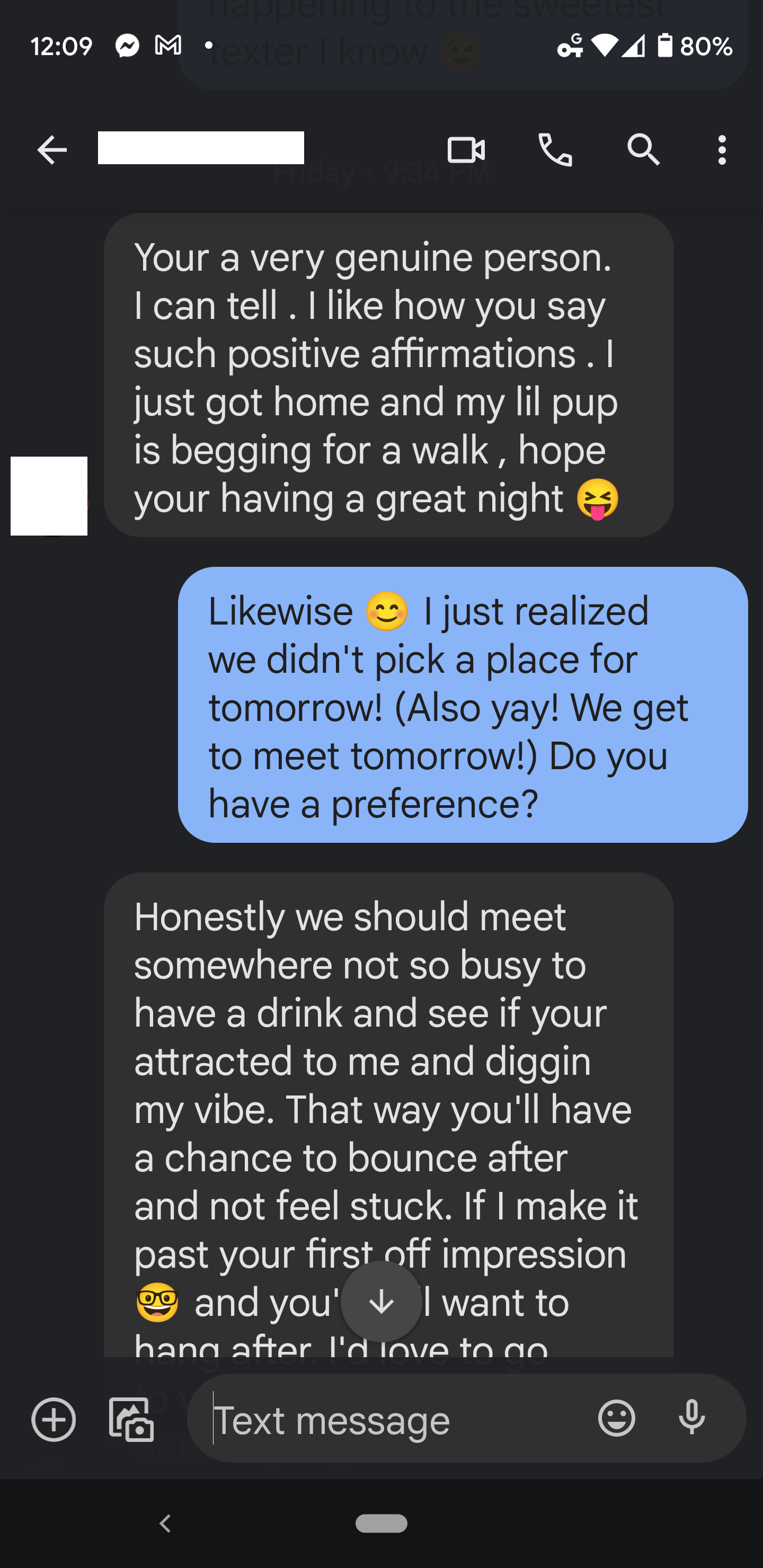 Throughout the night he dropped dozens of compliments and I wondered if there could be any romantic spark. I knew I liked him a lot and could definitely see us having fun as friends.