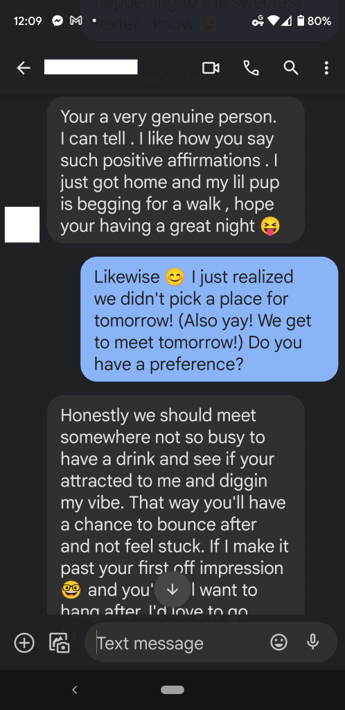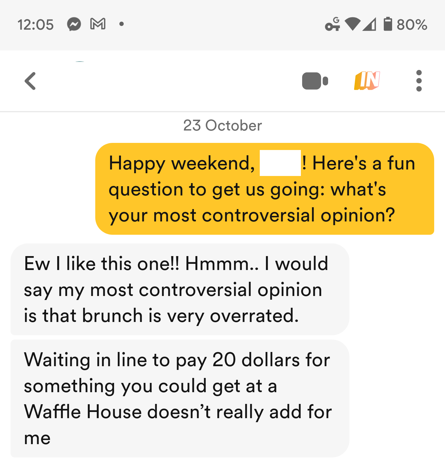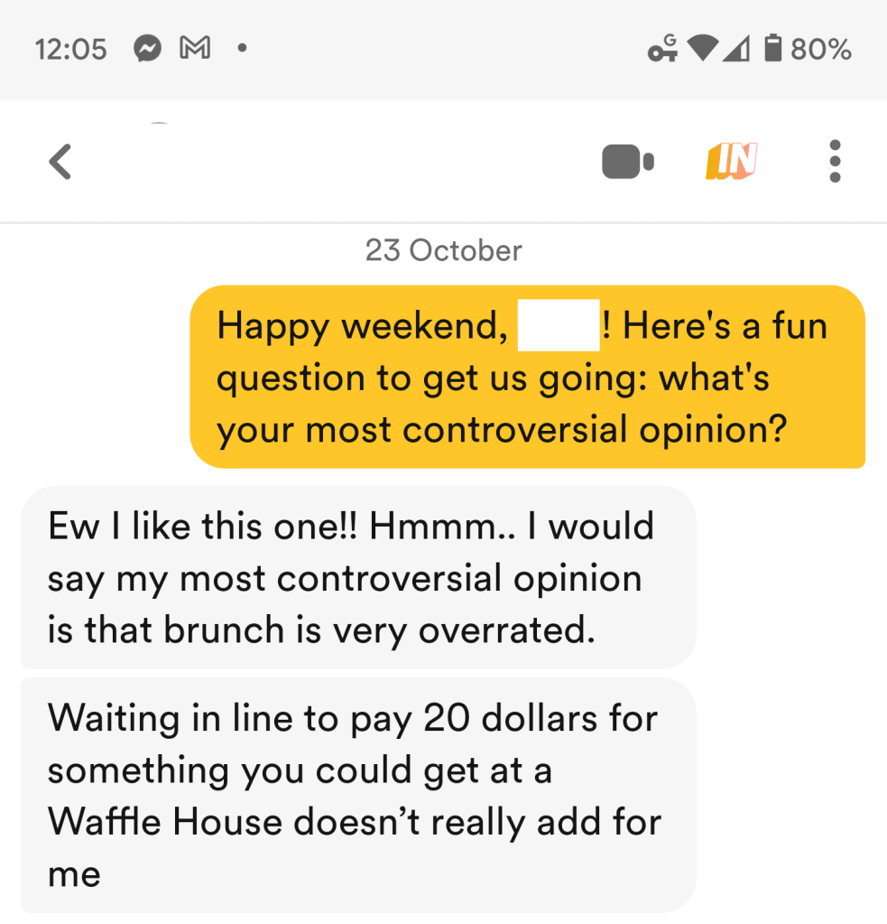 I clicked on the Hinge dating app message. It was always nice to see some text on the screen instead of a lazy ‘like’ with no accompanying message.