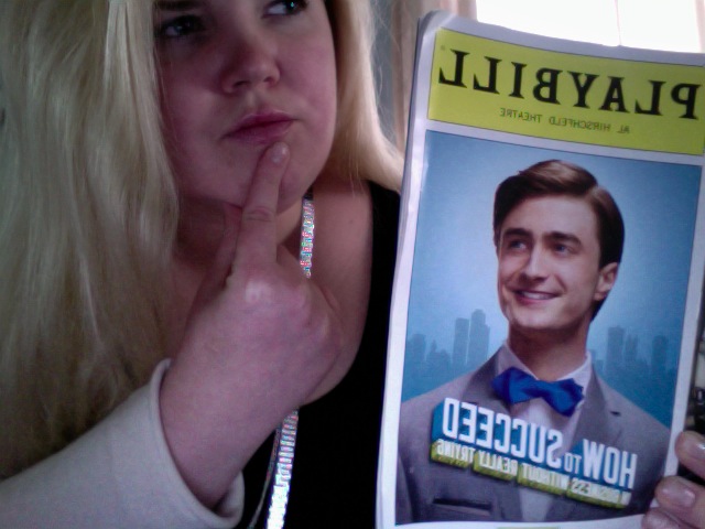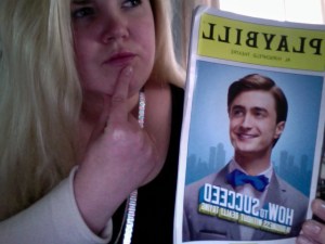 Nevertheless, I was thrilled to receive tickets to Daniel Radcliffe‘s new play for my birthday, “How to Succeed in Business Without Really Trying.” Hirschfeld Theater isn’t very big, so from the second row of the balcony I had no trouble enjoying a decidedly clothed Radcliffe (side note: I was able to convince my husband that Radcliffe shows his toosh in this one).
