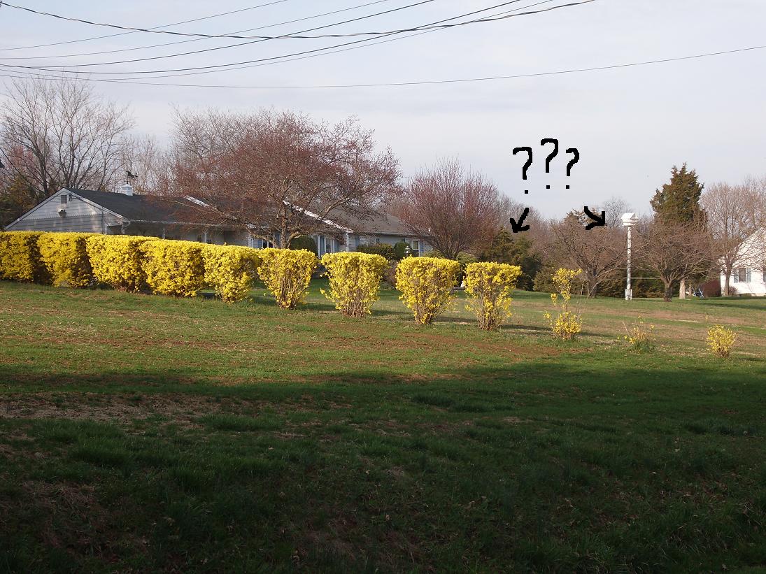 MILE 1.18: Luckily, it’s not long before we land in Pleasantville, but this too perplexes me. Are forsythia bushes supposed to look like that, and have the rest of us been offending Mother Nature unwittingly? And, P.S., what kind of birds are landing at this residence? I didn’t think turkeys could fly that high.