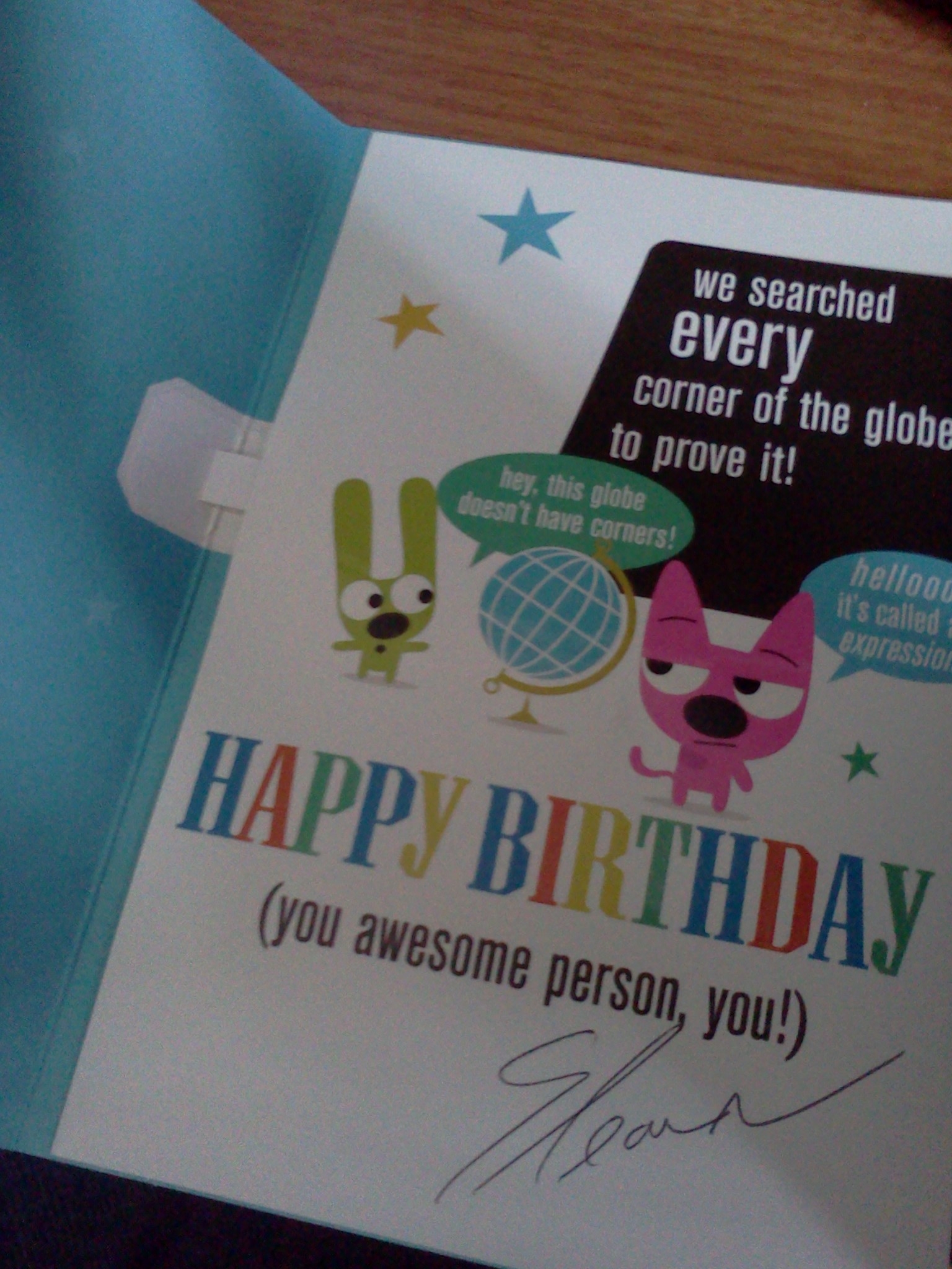Forget texts, forget Facebook, MySpace, Twitter, IM…I have no expectations when it comes to your social media well wishes, but giving me a real card with nothingbut your name written inside? Why bother! Sure, the dog dressed as a rabbit on the front might scream “Julie!”, but you know what else it screams? L-A-Z-Y. Just because you spent time and money seeking out and purchasing that card doesn’t mean you can let it do all the work for you.