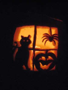 In homage to Lone Grey Squirrel’s entry, this pumpkin is THE ultimate teaching tool for any Cat Sensitivity Training program – the only program of its kind aimed at reducing squirrel and chipmunk anxiety. If the felines fail to pay attention, all you need to do is turn out the lights, fire up a match, and BAM!